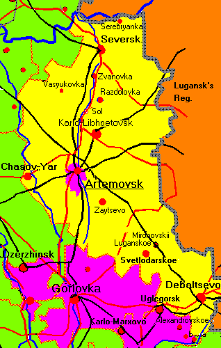 Artemovsk - regional center on Bakhmutka river (Don drainage basin), 81 km from Donetsk. Railroad station. Settlement appeared in XVII century. Until 1924 it was called Bakhmut, from 1783 the settlement became a city.